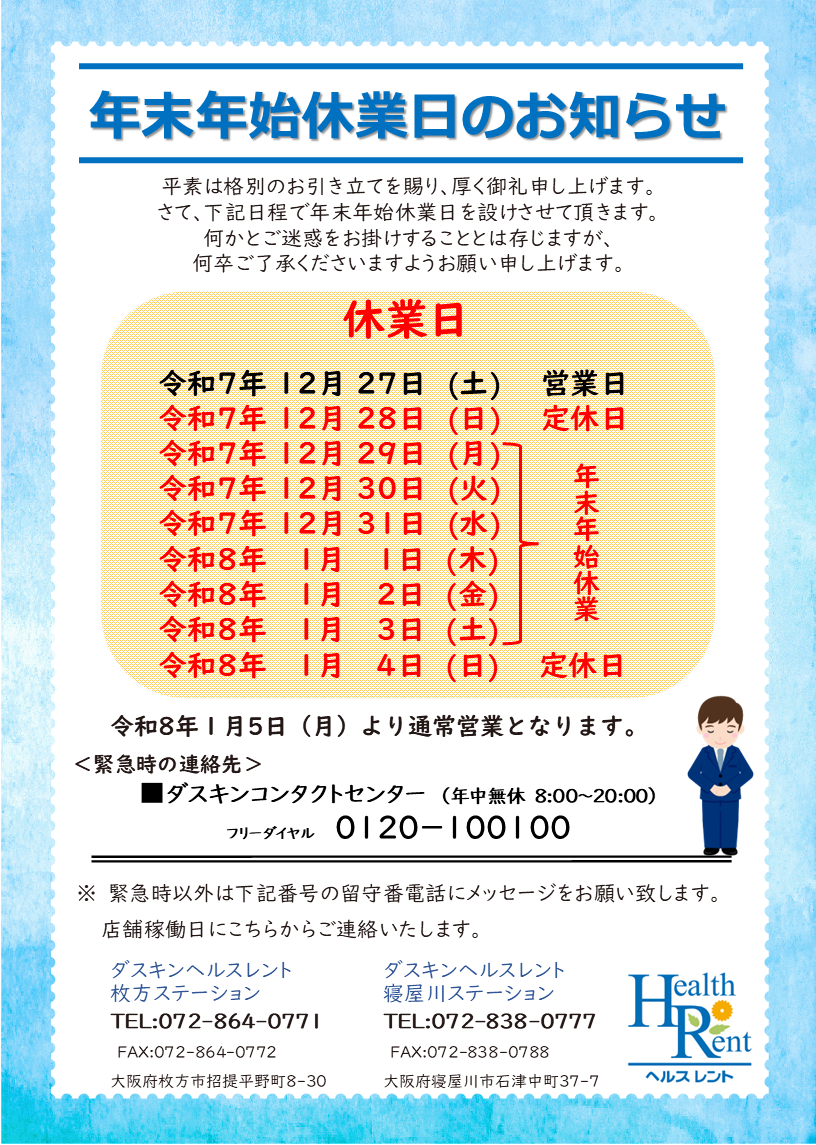 いつもダスキンヘルスレント枚方・寝屋川ステーションをご利用いただき誠にありがとうございます。